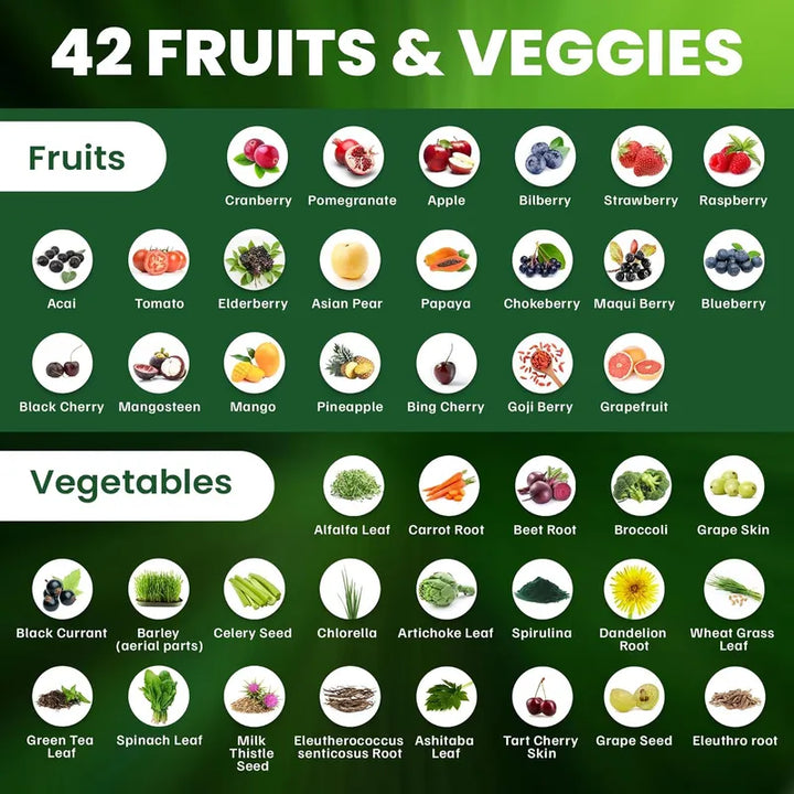 - 🌟 Optimiza tu salud: Con una potente combinación de 42 frutas y verduras, cada dosis cubre tus necesidades nutricionales diarias.