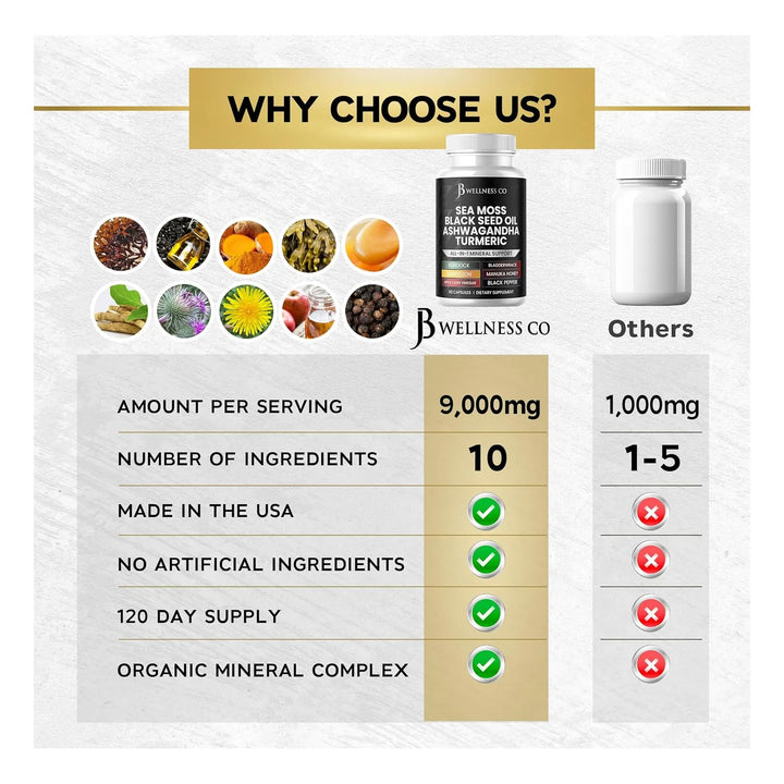 Imagina despertar cada día con energía radiante, sintiendo cómo tu cuerpo se revitaliza desde adentro. Eso es lo que lograrás con nuestro exclusivo suplemento de musgo marino, aceite de semilla negra, ashwagandha y cúrcuma. Una fórmula diseñada para quienes buscan simplificar su rutina de bienestar sin sacrificar resultados. ¿Cansado de tomar decenas de pastillas diferentes? Este es el fin de los gabinetes llenos de frascos. Una sola cápsula concentra lo mejor de la naturaleza para apoyar tu salud celular, digestión, energía y vitalidad.