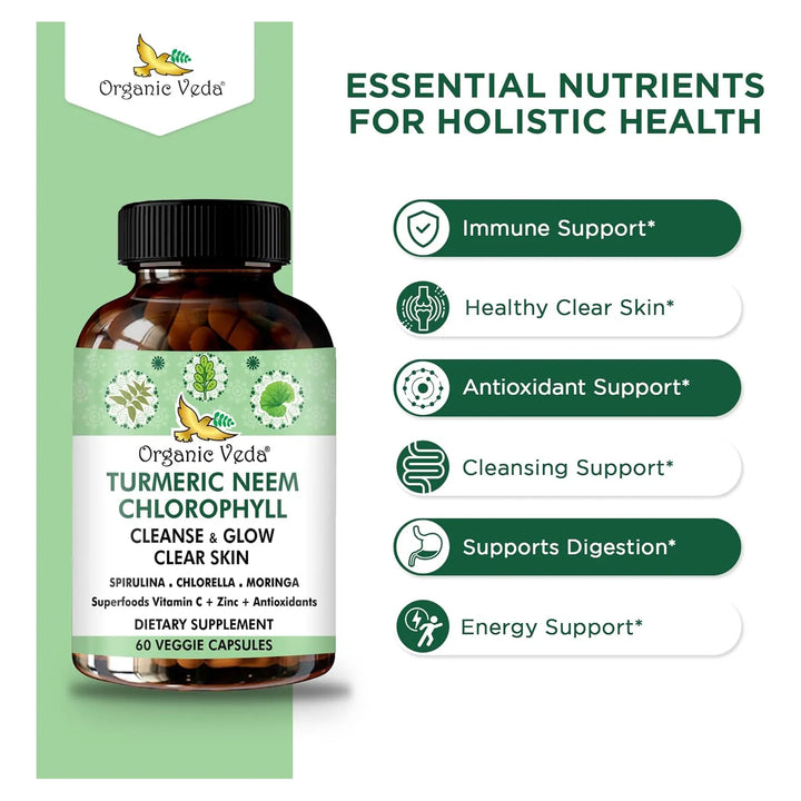 Este poderoso suplemento combina ingredientes 100% orgánicos como neem, cúrcuma, clorofila, espirulina y moringa, diseñados para desintoxicar tu cuerpo, fortalecer tu sistema inmunológico y rejuvenecer tu piel. ¿Sabías que el neem es conocido como "la farmacia del pueblo" en la India por sus propiedades antibacterianas? Y la cúrcuma, con su curcumina, es un antiinflamatorio natural. Juntos, son una combinación imbatible.