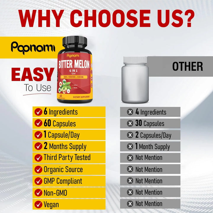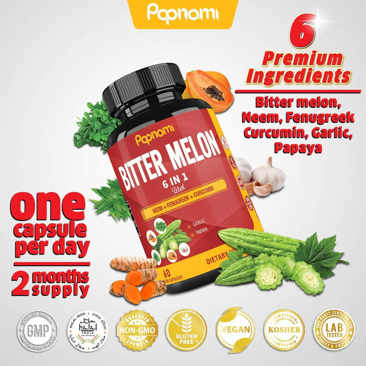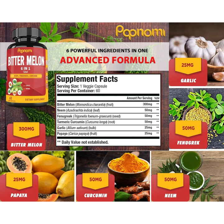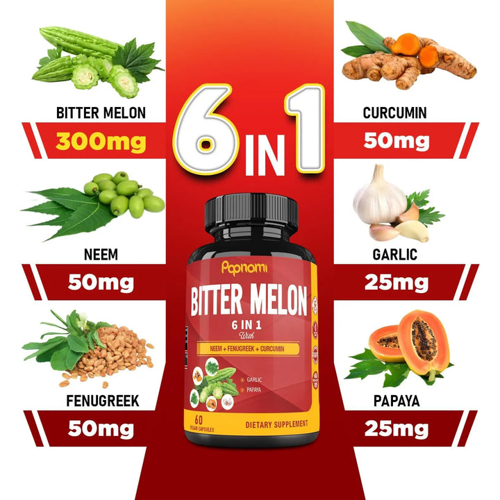 El melón amargo, conocido científicamente como Momordica charantia, ha sido utilizado durante siglos en la medicina tradicional por sus propiedades únicas. Combinado con otros poderosos ingredientes como neem, fenogreco, curcumina, ajo y papaya, este suplemento es una verdadera joya de la naturaleza. Cada cápsula está diseñada para ofrecerte lo mejor de estos ingredientes, respaldados por procesos de fabricación GMP y certificaciones ISO que garantizan su calidad y eficacia.