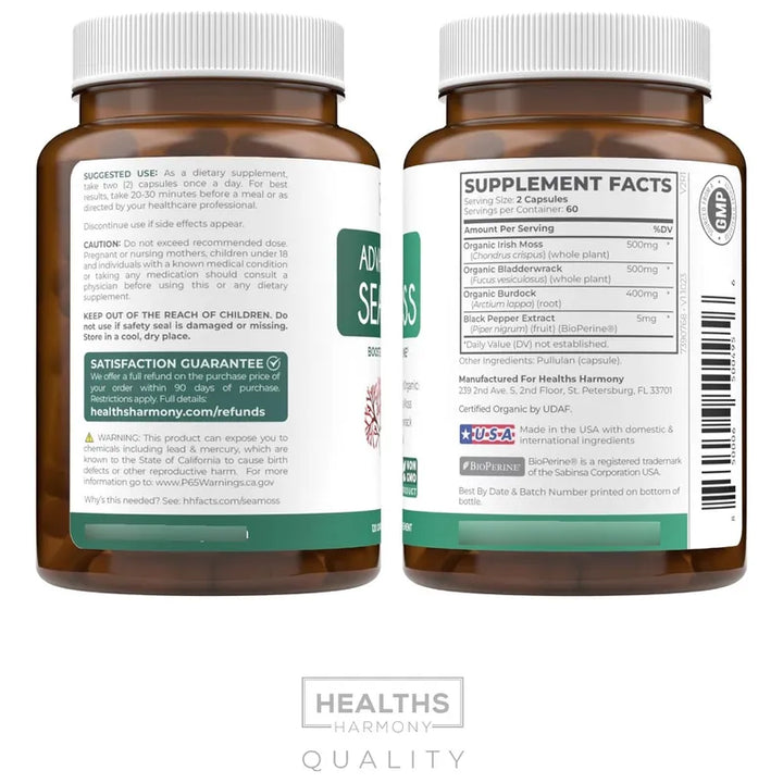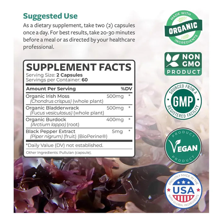 🌿 Sentirás cómo cada cápsula trabaja en armonía con tu cuerpo, potenciado por una fórmula orgánica certificada, rica en vitaminas, minerales y antioxidantes vitales. El secreto está en nuestra mezcla única de Seamoss irlandés, raíz de bardana y vejiga, reforzada con extracto de pimienta negra para maximizar la absorción de nutrientes. Con cada dosis, tu cuerpo recibe la ayuda necesaria para eficientizar su metabolismo y mejorar la función tiroidea.