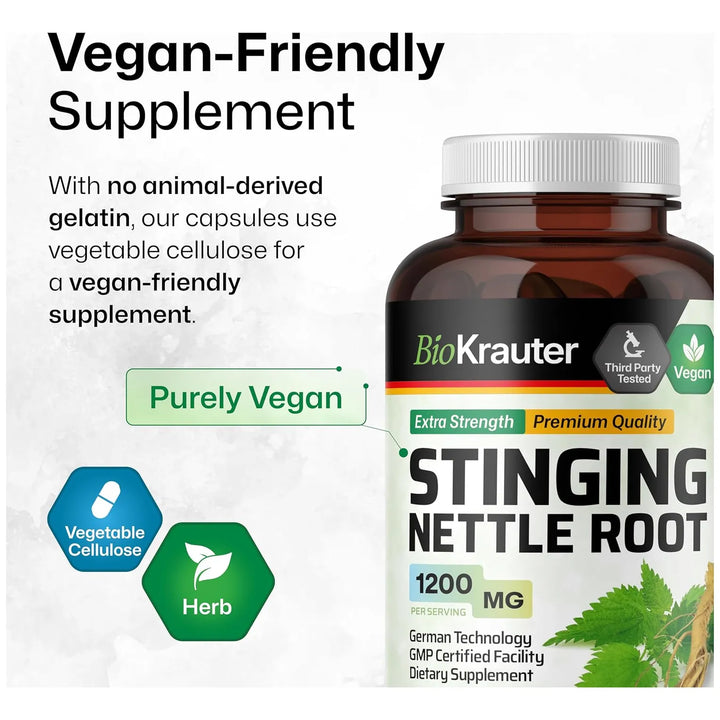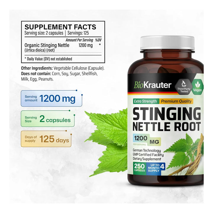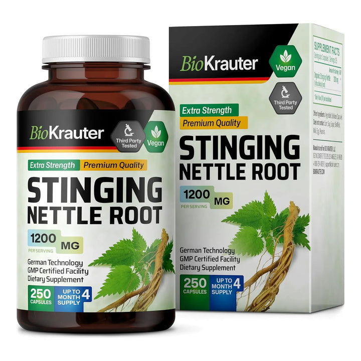 - Potente concentración: 1200 mg de polvo de raíz de ortiga por cápsula 💪