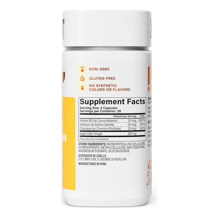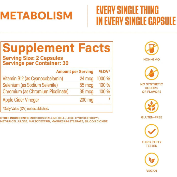 Nuestro suplemento actúa desde el núcleo celular, optimizando tu metabolismo y mejorando la digestión. La vitamina B12 fomenta la producción de energía mientras el selenio y el cromo estabilizan funciones esenciales como el nivel de azúcar en la sangre. Por su parte, el vinagre de sidra de manzana apoya una digestión suave y optimiza el consumo de calorías. 🍏