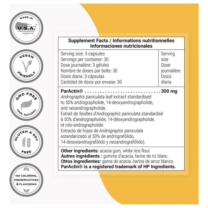 Cápsulas Paractin 300mg Extracto Andrographis Paniculata Sin OMG Ni Gluten 90 Unidades