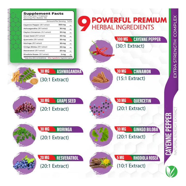 Imagina cada día comenzando con una sensación renovada, libre de la fatiga diaria y llena de vigor. La sinergia entre la Pimienta de Cayena, el Ashwagandha, y otros ingredientes como la Canela de Ceilán y el Ginkgo Biloba, está diseñada meticulosamente para potenciar tu energía natural sin el subidón y bajón que otras sustancias pueden causar. 🌿