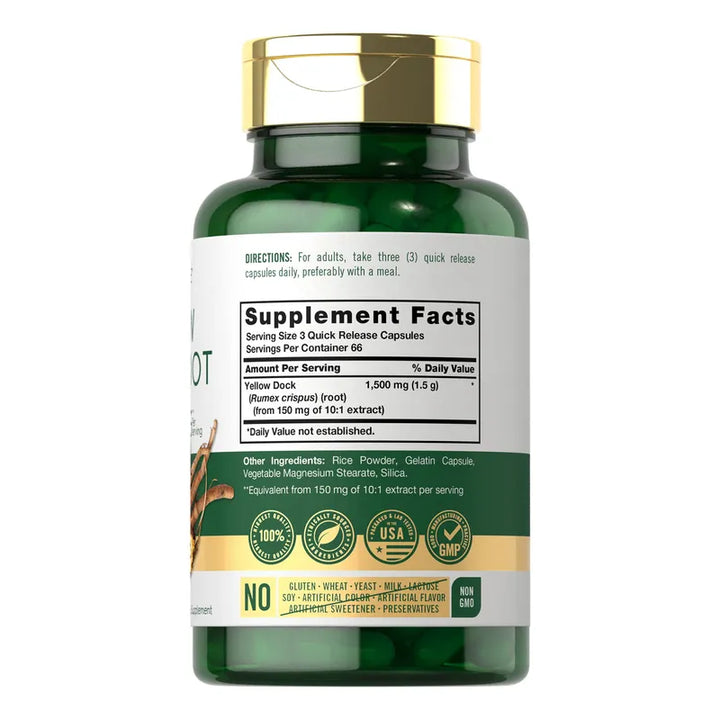 Nuestras cápsulas te ofrecen una alta concentración de 1500 mg por porción, asegurando que recibas todo el beneficio de la raíz de muelle amarillo en cada ingesta. Diseño de liberación rápida significa que tu cuerpo absorbe los nutrientes más eficientemente. No más esperas para sentirte revitalizado.