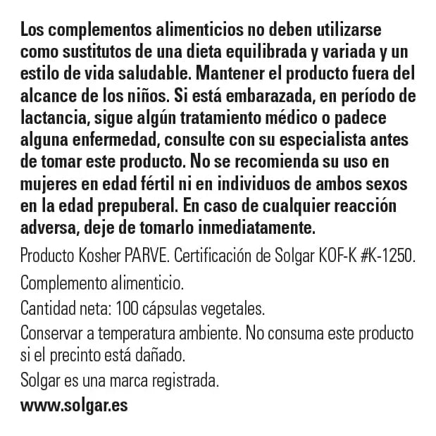 Calidad Garantizada: Solgar ha estado al frente de la nutrición de calidad por más de 70 años, comprometido siempre con tu bienestar. La pureza y la integridad de nuestros productos son inigualables.