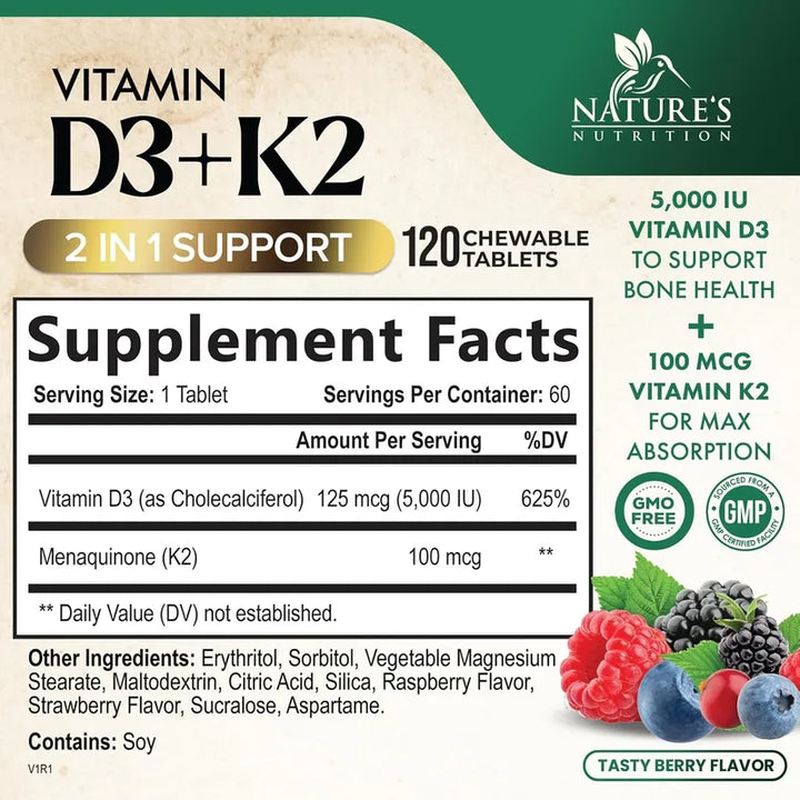 Este suplemento no es solo una adición a tu rutina diaria; es un aliado para tus huesos, articulaciones y corazón. Con la combinación de 5000 UI de Vitamina D3 con 100 mcg de K2 MK-7, cada cápsula actúa como un escudo para tu salud, optimizando la absorción de calcio, esencial para mantener huesos fuertes y un sistema inmunológico robusto.