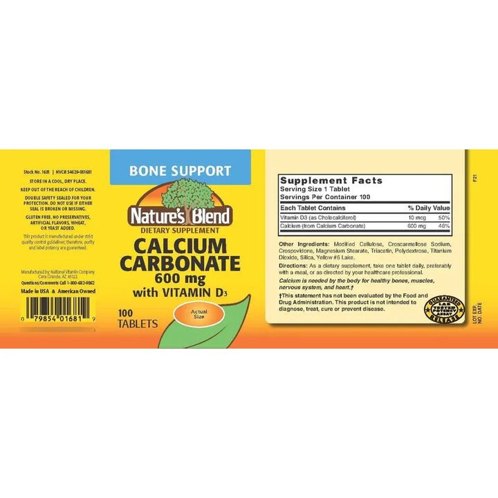 Carbonato De Calcio 600 Mg Vitamina D3 400 Ui 100 Tabletas Nature's Blend
