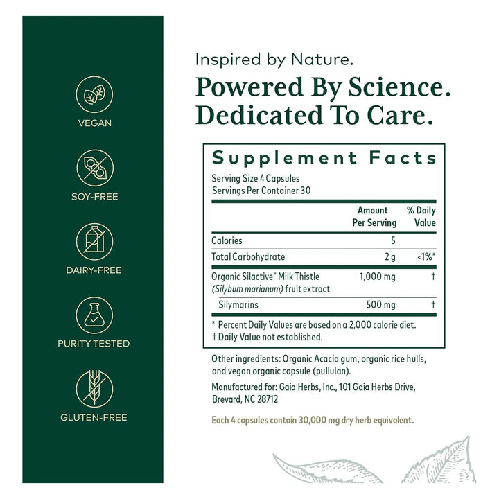 - 1000 mg de extracto puro por cápsula, estandarizado en 500 mg de silimarinas por dosis. �