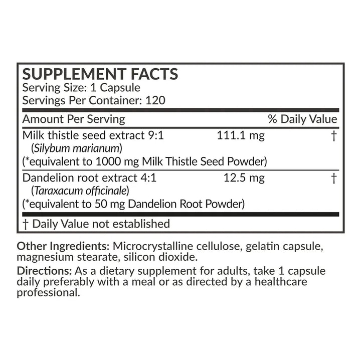 Imagine una fórmula de alta potencia donde cada cápsula brinda 1,000 mg de extracto de cardo mariano. Este potente antioxidante trabaja para apoyar la salud hepática de manera efectiva. Con la adición de 50 mg de raíz de diente de león, se facilita la desintoxicación, apoyando aún más la función hepática y ayudándote a eliminar el exceso de agua de tu cuerpo. 🌱