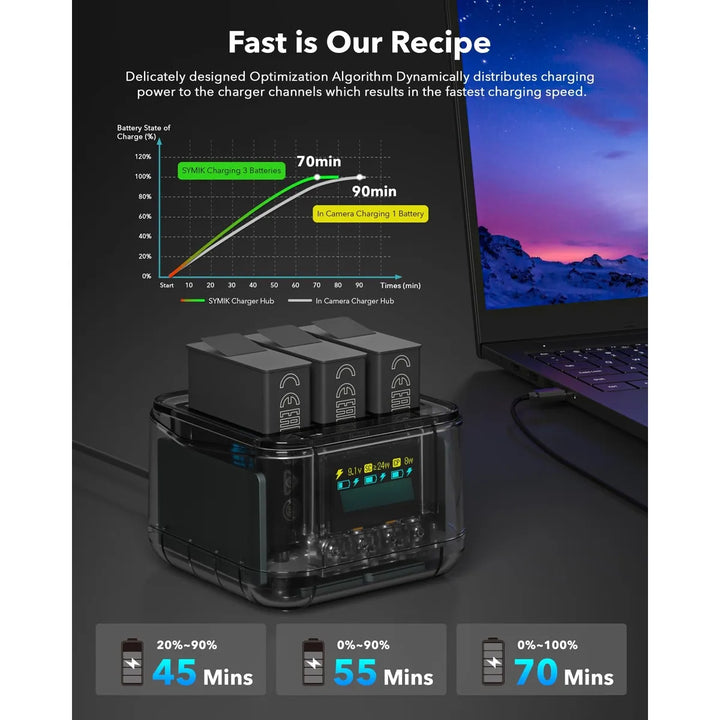 - 🚀 Carga Ultra Rápida: 3 baterías al mismo tiempo en solo 45 minutos. ¡Más tiempo grabando, menos esperando!