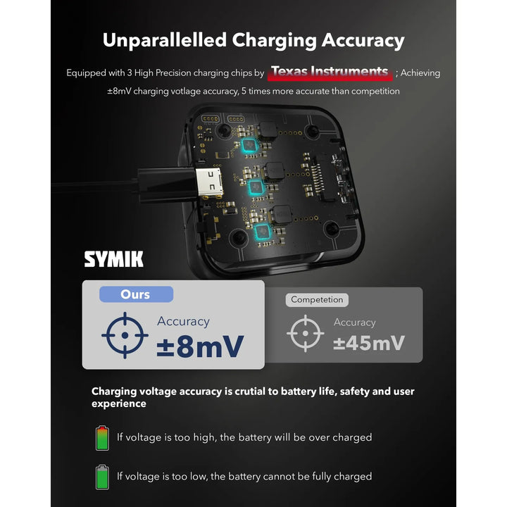 El cargador utiliza tecnología de chips de Texas Instruments para gestionar la carga de cada batería con una precisión de 8mV, evitando daños por sobrecarga. La pantalla OLED te brinda datos exactos, mientras que el modo boost acelera la carga cuando lo necesites.
