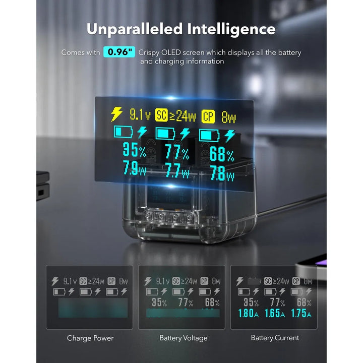 ¿Cansado de cargadores lentos que no muestran el estado real de tu batería? Nuestro cargador resuelve ese problema con una pantalla OLED clara y chips de alta precisión que protegen tus baterías de sobrecargas. ¡Dile adiós a la incertidumbre y hola a la confianza absoluta en tu equipo!