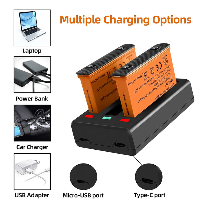 - 🎁 Kit completo: Incluye cargador, 2 baterías y cable USB. ¡Solo falta tu cámara!