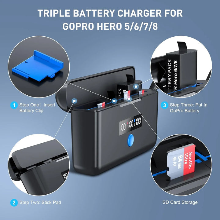 No importa si tienes una GoPro Hero 5 o la última Hero 11, nuestro cargador está diseñado para adaptarse perfectamente. Con protección inteligente contra sobrecargas, cortocircuitos y sobrecalentamiento, puedes confiar en que tus baterías están seguras mientras se cargan. La pantalla LED te muestra el progreso en tiempo real, para que siempre sepas cuánto falta.