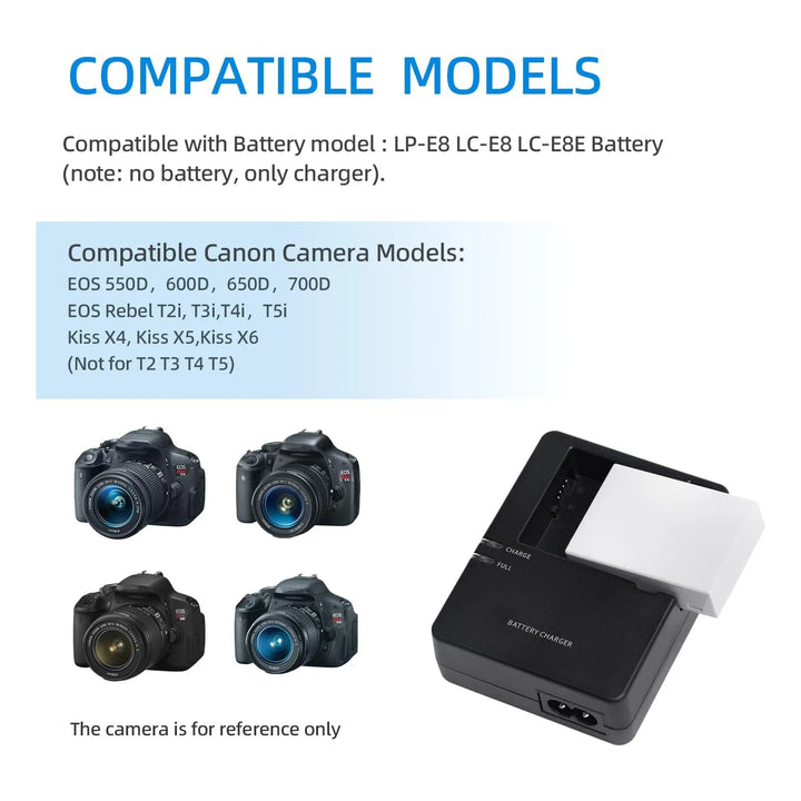 ¿Cansado de cargadores genéricos que fallan o no cumplen con los estándares de calidad? Nuestro cargador está específicamente diseñado para baterías LP-E8, garantizando compatibilidad con modelos Canon EOS Rebel T2i, T3i, T4i, T5i, y más. Con múltiples capas de protección, incluyendo sobrecarga y cortocircuitos, podrás cargar tus baterías con total seguridad y confianza.