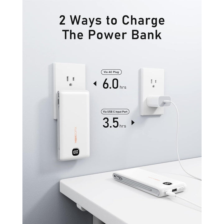 Este cargador portátil no es solo otro gadget, es tu nuevo mejor amigo. Con un enchufe de pared de CA integrado, puedes recargarlo directamente del tomacorriente sin necesidad de cables adicionales. Imagina la comodidad de cargar varios dispositivos a la vez gracias a sus 5 puertos de salida, ideal para quien maneja múltiples dispositivos como teléfonos, tablets y más.
