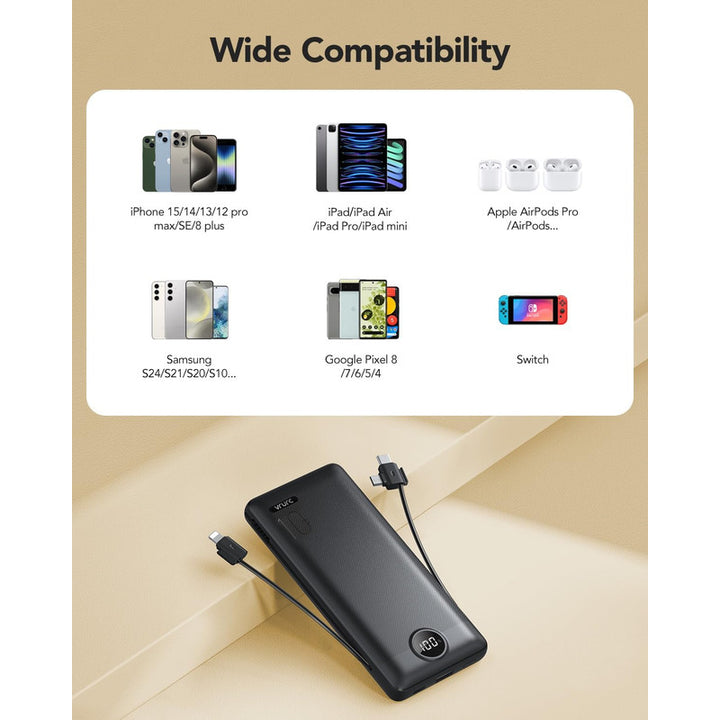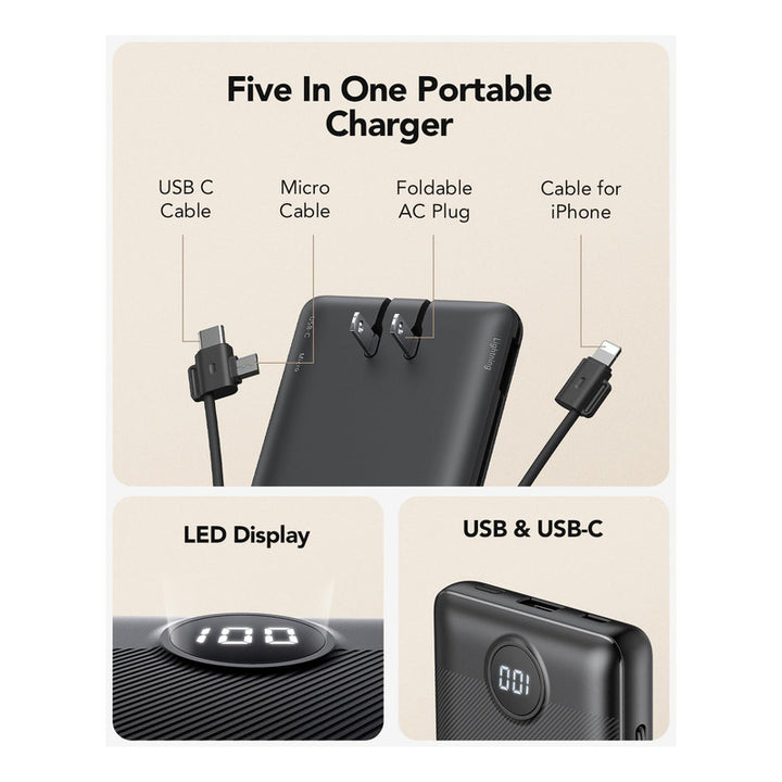 Este cargador portátil ofrece una experiencia de carga sin complicaciones. Simplemente conectas tu dispositivo utilizando uno de los cables integrados, o utilizas el puerto USB/USB C si prefieres otro puerto. Al finalizar, puedes cargar el cargador portátil directamente desde una toma de corriente de CA usando su enchufe integrado.