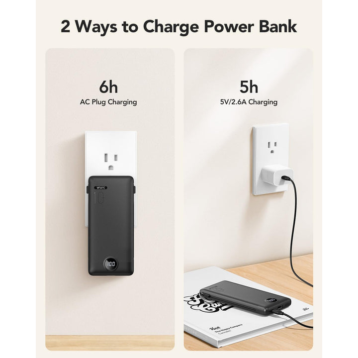 - Una vez agotada la carga, conecta el cargador portátil a una toma de corriente para recargar, utilizando el enchufe de pared integrado.