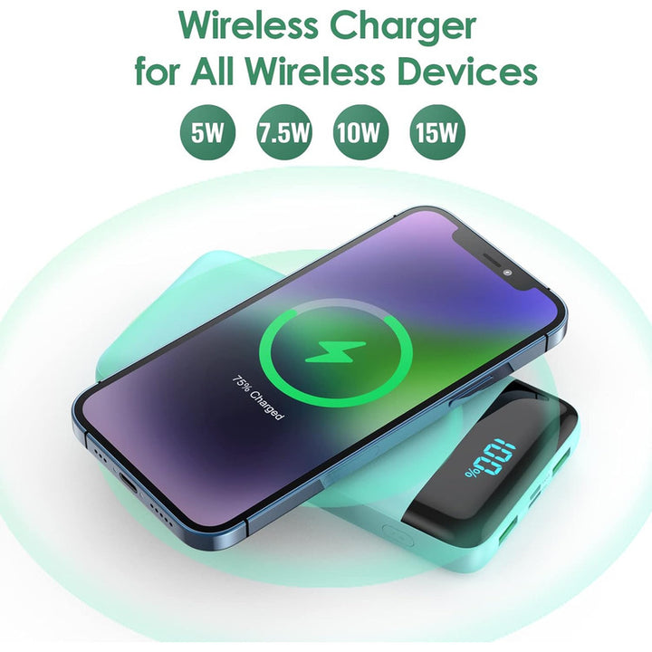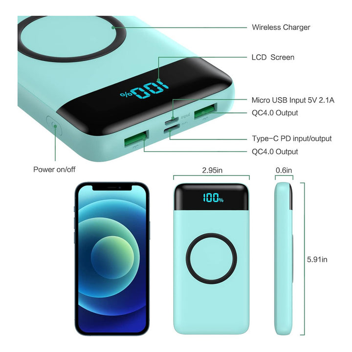 El Cargador Portátil Inalámbrico FOCHEW combina potencia y portabilidad, permitiéndote cargar tus dispositivos de manera inalámbrica o por cable. La tecnología Power Delivery (PD) de la entrada USB-C maximiza la eficiencia energética, haciendo que la carga sea rápida y segura.