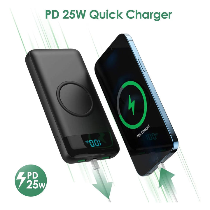 Equipado con carga rápida PD de 25W y tecnología QC 4.0, este power bank carga tus dispositivos hasta 5 veces más rápido que un cargador convencional. ¿Necesitas recargar tu teléfono en minutos? Con este cargador, tu iPhone 12 estará al 100% en solo 1.5 horas.