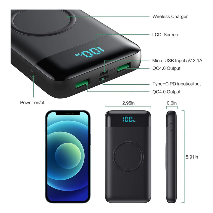 Imagina estar en medio de un viaje importante, una reunión de trabajo o grabando esos momentos especiales y que tu teléfono se apague. Con el Cargador Portátil Inalámbrico Power Bank 30800mAh, esa preocupación queda en el pasado. Este poderoso banco de energía no solo te ofrece una carga rápida y eficiente, sino que también lo hace de manera inalámbrica, liberándote de los molestos cables.
