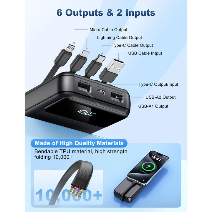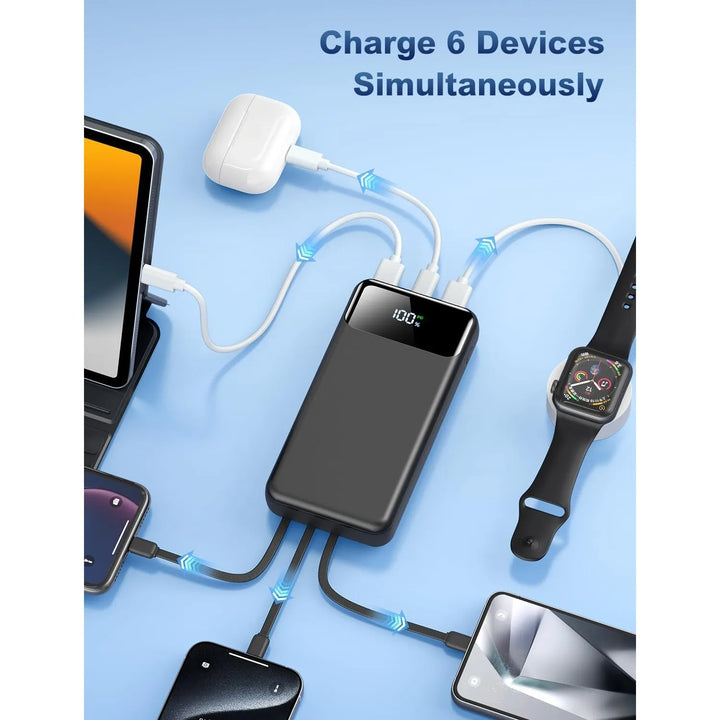 - Versatilidad total 🔄: Carga hasta 6 dispositivos a la vez con cables integrados y puertos múltiples.
