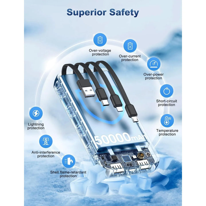 - Energía para días 🚀: Con 50000 mAh, carga tu iPhone hasta 10 veces o múltiples dispositivos sin parar.