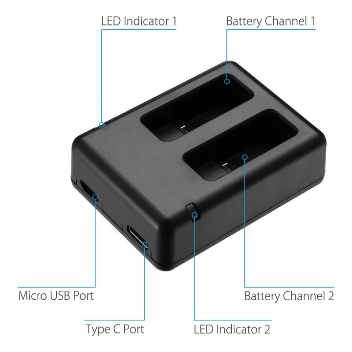 - ⏱️ Ahorra tiempo valioso cargando dos baterías al mismo tiempo, para que nunca te pierdas un momento.