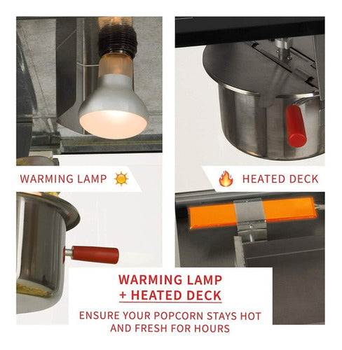 La máquina crispetera funciona calentando el maíz con su potente sistema de cocción, logrando una expansión perfecta sin quemarlo. Su diseño asegura que las crispetas se mantengan crujientes y sabrosas, listas para servir en pocos minutos.