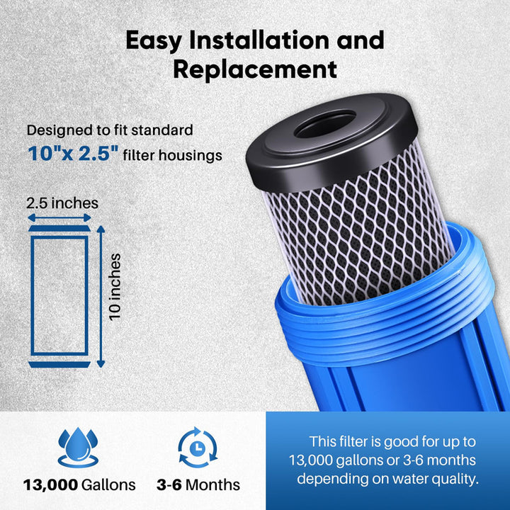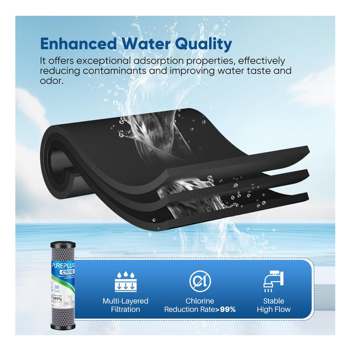 El Cartucho De Filtro Pureplus utiliza carbón activado avanzado para atrapar contaminantes tan pequeños como de 1 micrón. Así, logra transformar agua corriente en un líquido limpio y seguro para el consumo diario. Simplemente instala el cartucho en tu sistema de filtración estándar de 10 x 2,5 pulgadas, y deja que el filtro haga su magia. 🌟