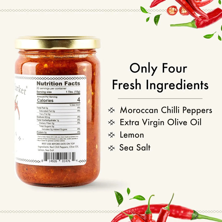 Esta salsa logra su magia mediante la mezcla cuidadosa de chiles rojos marroquíes con aceite de oliva y limones, creando un perfil de sabor complejo pero equilibrado. Su proceso de elaboración artesanal preserva la esencia de las especias, garantizando una experiencia auténtica en cada uso.