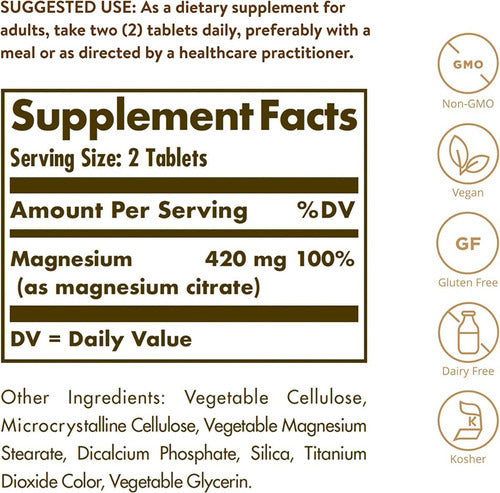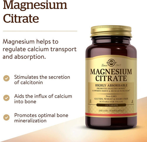 Citrato de Magnesio Solgar 240 Tabletas Altamente Absorbente Apoya Huesos y Energía