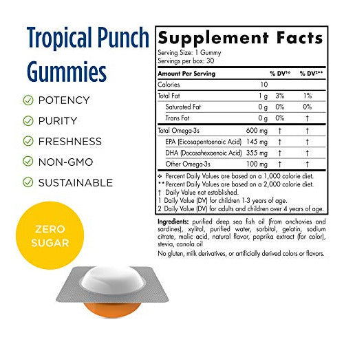 ¿A tu hijo no le gusta el pescado? No te preocupes. Estas gomitas son la solución perfecta. Con un sabor tropical irresistible, tus pequeños estarán recibiendo todos los nutrientes esenciales sin siquiera darse cuenta. Cada gomita es un bocado de salud que apoya el aprendizaje y la inmunidad, mientras disfrutan de su sabor preferido. Además, vienen en cómodos paquetes individuales, asegurando frescura y facilidad en cualquier lugar.