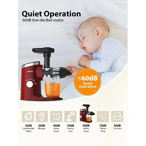 ¿Cansado de jugos que pierden su sabor y nutrientes en minutos? La tecnología de masticación lenta del Aeitto extrae hasta la última gota de sabor y nutrición, reduciendo la oxidación para que tus jugos duren más y sean más puros. Con sus dos velocidades, puedes preparar desde un suave jugo de naranja hasta un potente extracto de jengibre o col rizada, todo con el mismo equipo. Y lo mejor: su diseño silencioso (<60 dB) te permite usarlo a cualquier hora sin molestar a tu familia.