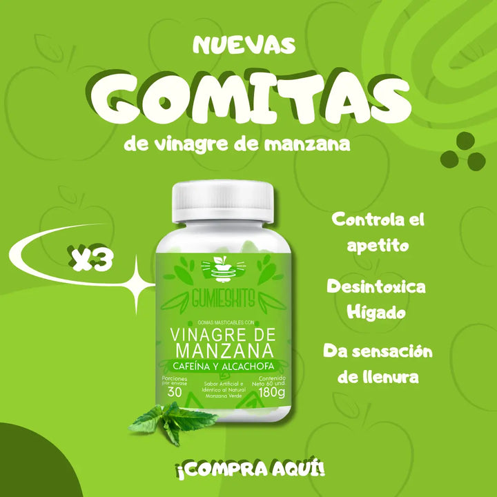 Las Gomitas de Vinagre de Manzana X3 funcionan combinando tres ingredientes clave: vinagre de manzana, cafeína y alcachofa. El vinagre de manzana es conocido por su capacidad para regular el apetito y mejorar la digestión, lo que ayuda a sentirte lleno por más tiempo. La cafeína acelera el metabolismo, promoviendo la quema de grasa, mientras que la alcachofa desintoxica el hígado, limpiando tu cuerpo de impurezas. Juntos, estos ingredientes trabajan en sinergia para que puedas perder peso, mejorar tu bienestar y sentirte lleno de energía.