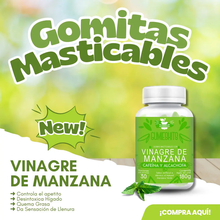 Estas gomitas están diseñadas para aquellos que desean una forma fácil y agradable de incorporar los poderosos beneficios del vinagre de manzana en su rutina diaria. Con una combinación única de vinagre de manzana, cafeína y alcachofa, te ofrecen una experiencia refrescante y sabrosa, todo con el sabor natural de manzana verde que tanto te gusta. Cada envase trae 60 gomitas de 180 gramos, lo que te proporciona porciones para 30 días completos, ¡con 2 gomitas al día es suficiente para notar la diferencia!