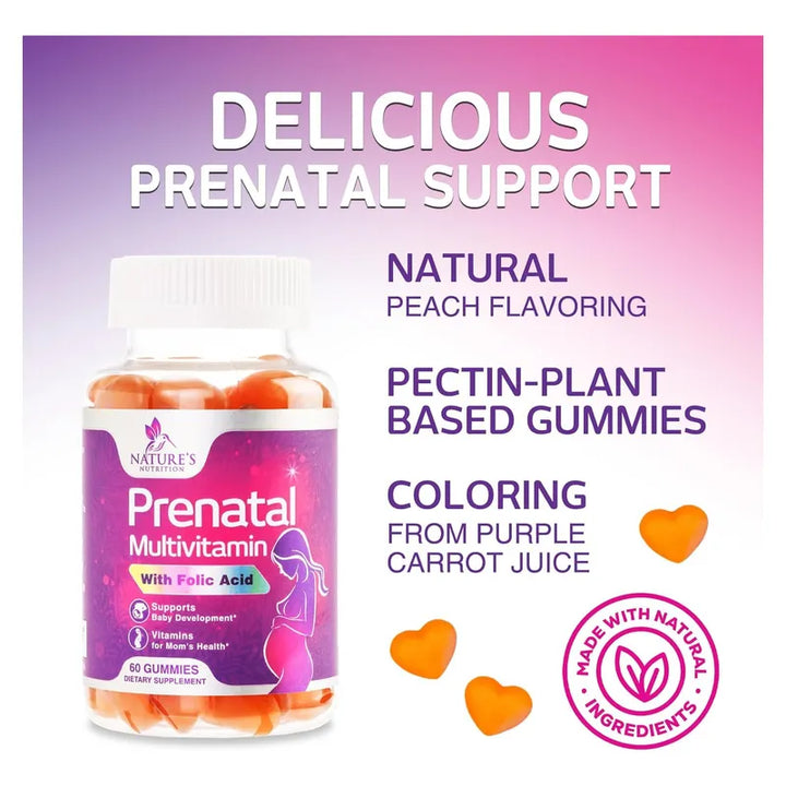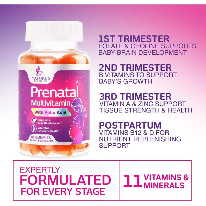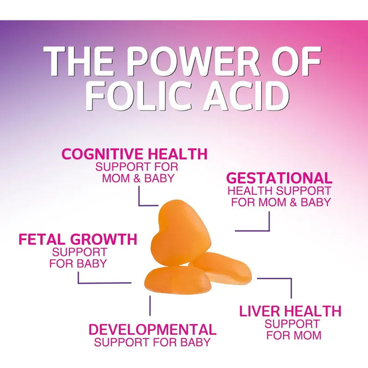 Estas gomitas actúan como un multivitamínico completo que aporta al organismo los nutrientes que necesitas para un embarazo saludable. Las vitaminas y minerales ayudan a desarrollar un sistema inmunológico robusto, apoyan el crecimiento del cerebro del bebé y fortifican tu salud general durante el embarazo.