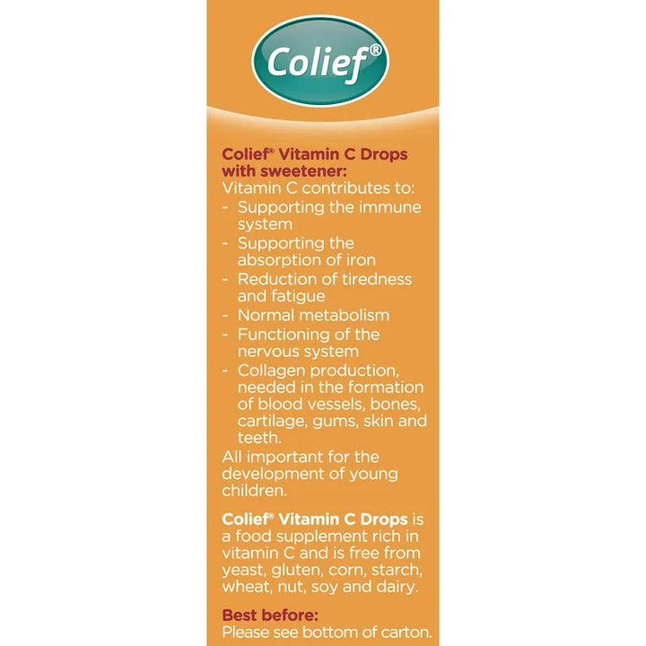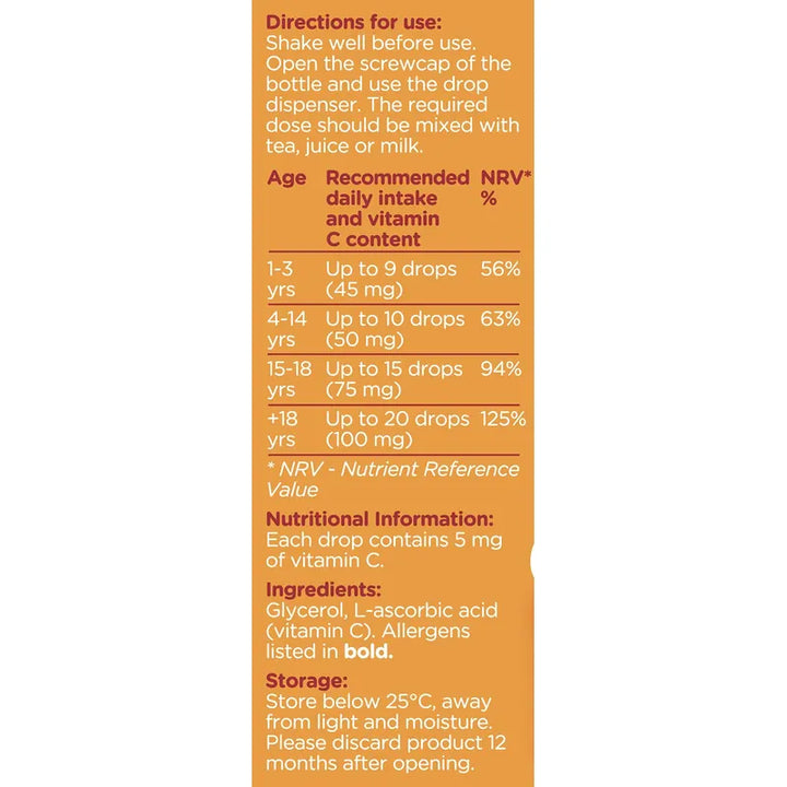 Nuestras gotas de vitamina C contribuyen al fortalecimiento del sistema inmunológico, la producción de colágeno y la absorción de hierro, apoyando así el desarrollo de huesos, dientes, piel y tejidos corporales de los niños pequeños.