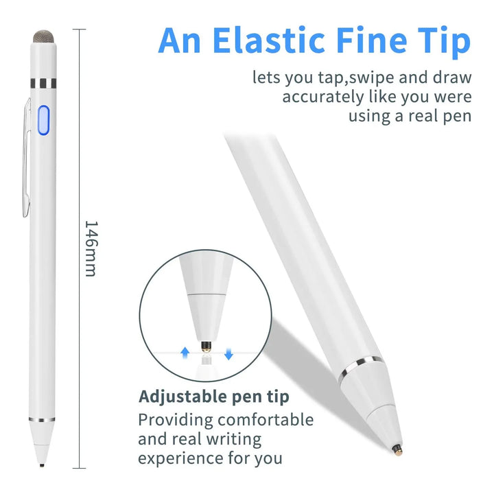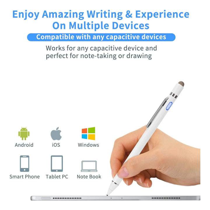 El Lápiz Digital Ultrafino utiliza tecnología capacitiva avanzada para interactuar con tu pantalla táctil como si fuera un dedo, pero con la precisión de un bolígrafo. Su punta ultrafina detecta cada movimiento con exactitud, permitiéndote dibujar líneas finas o escribir con claridad. La unidad de amortiguación en la punta reduce el ruido y mejora el control, ofreciendo una experiencia de escritura suave y sin saltos.
