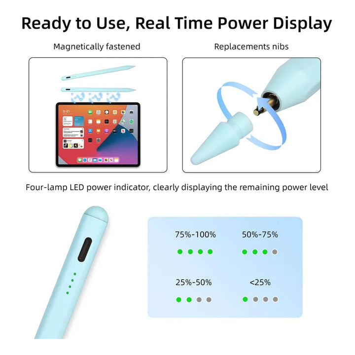 Este fantástico lápiz se adapta perfectamente a la palma de tu mano con su diseño cilíndrico y acabado magnético que se adhiere a tu iPad para prevenir pérdidas. No te preocupes más por interrupciones imprevistas gracias a su indicador de nivel de energía que te permite planificar tu tiempo de trabajo. 😍
