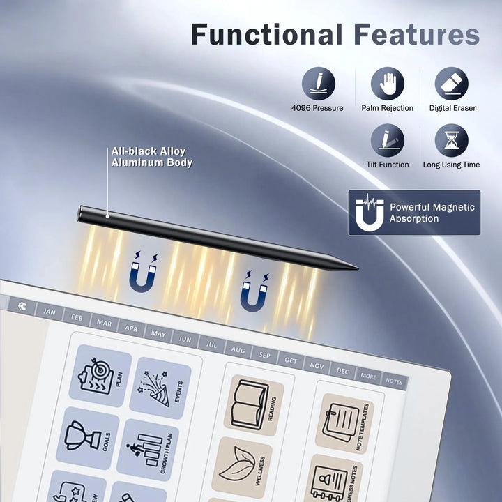 - 🖋️ Diseño magnético: Nunca más perderás tu lápiz. Se adhiere a tu tableta para un almacenamiento seguro y fácil acceso.