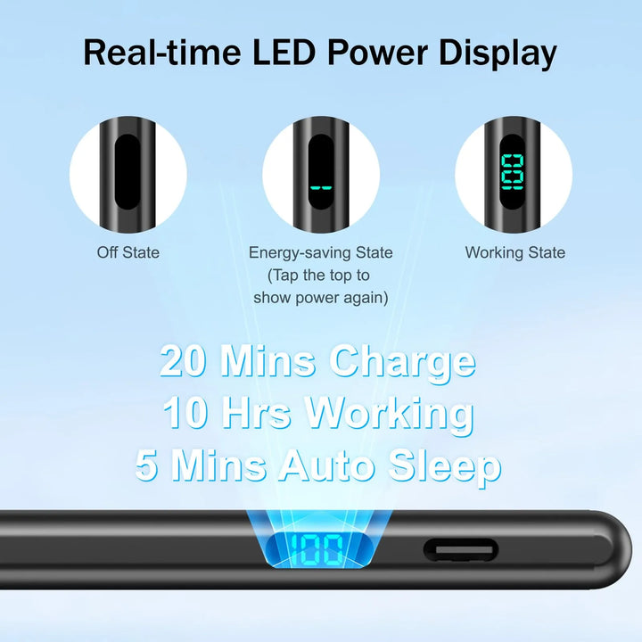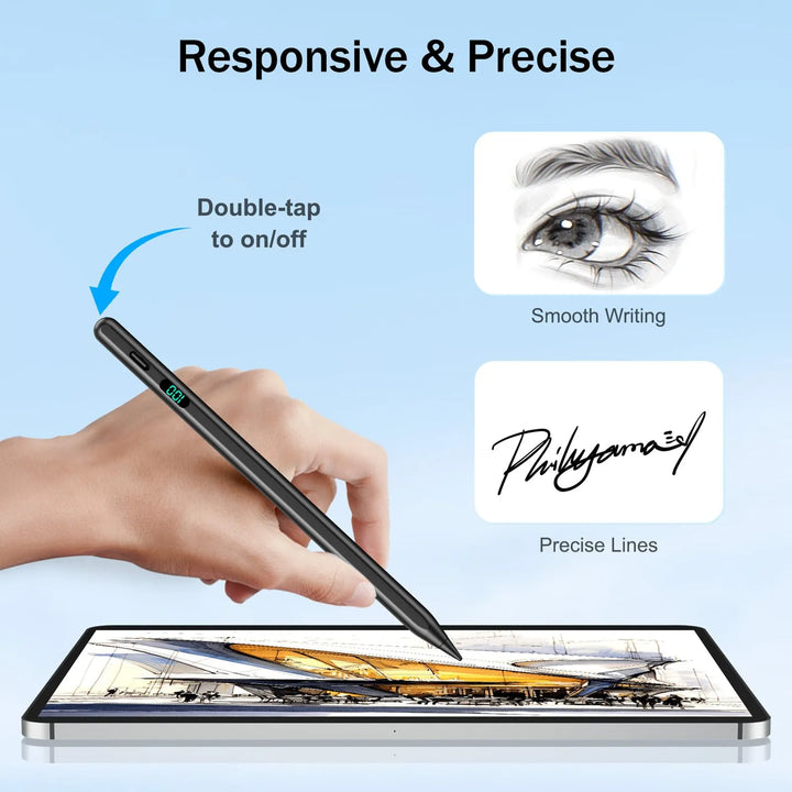 El lápiz óptico se conecta de forma inalámbrica a tu iPad, permitiéndote escribir y dibujar con una precisión milimétrica. La pantalla LED te mantiene informado sobre el estado de la batería, mientras que la carga rápida asegura que siempre estés listo para crear. Simplemente toca dos veces la parte superior del lápiz para activar funciones adicionales, como el borrado rápido o el cambio de herramientas.