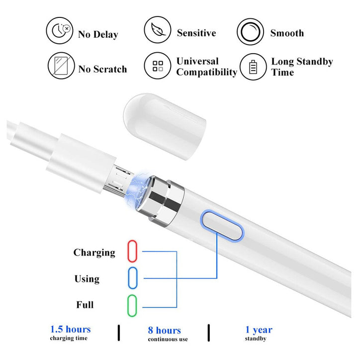 Este Stylus Pen ofrece una acción rápida y sin interrupciones, eliminando la preocupación de baterías descargadas gracias a su uso prolongado de hasta 10 horas con solo 90 minutos de carga.