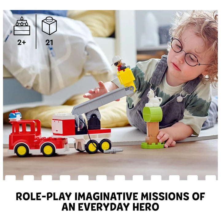 El Lego Duplo Camión De Bomberos 10969 está diseñado para que los niños exploren su imaginación mientras desarrollan habilidades esenciales. El camión de bomberos cuenta con una palanca que permite subir y bajar la escalera, y una canasta giratoria para simular rescates. Los niños pueden usar la manguera de agua (simbólica) para "apagar el fuego" y alimentar al gato con la pieza de comida incluida. Cada acción promueve el juego simbólico, clave para el desarrollo cognitivo y emocional.