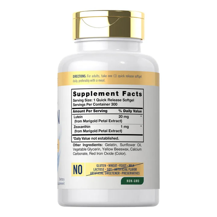 Con 300 cápsulas blandas de alta calidad, tendrás una fuente constante de salud visual. Deja de preocuparte por la fatiga ocular o la pérdida de visión a medida que envejeces. Este suplemento, libre de gluten, soja y organismos modificados genéticamente, es todo lo que necesitas para mantener la salud de tus ojos a largo plazo.