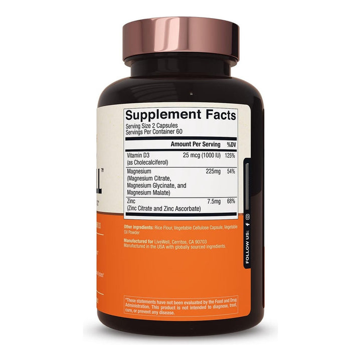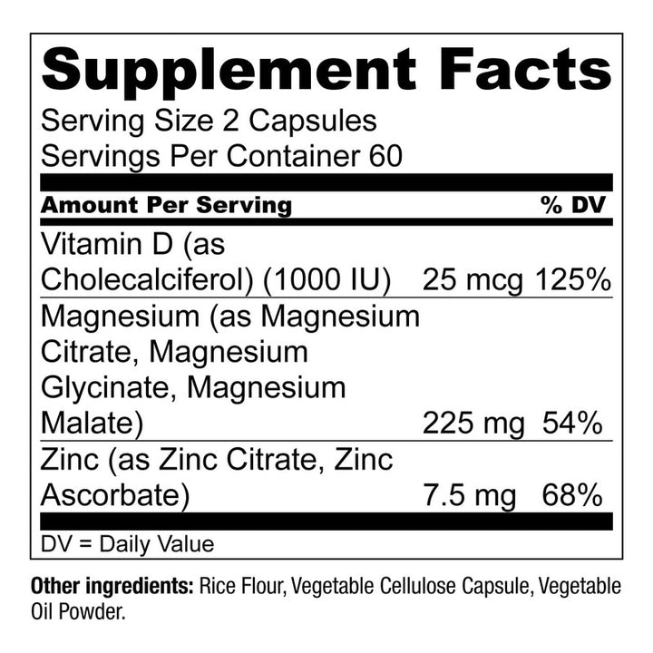 Este suplemento funciona al proporcionar formas biodisponibles de magnesio, zinc y vitamina D3 que el cuerpo absorbe rápidamente para mejorar la salud ósea, muscular y del sistema inmunitario.