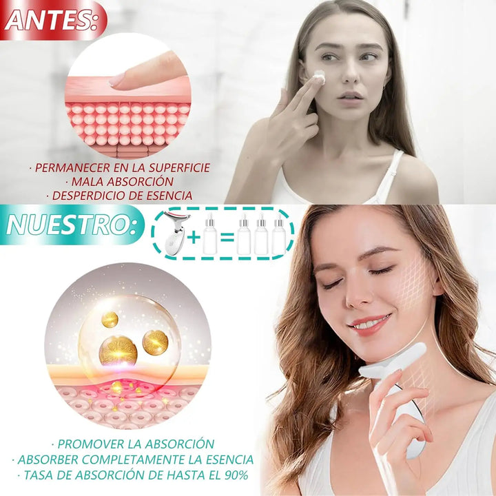 Imagina aplicar tu serum favorito y ver cómo se absorbe más profundamente, mientras las luces LED especializadas trabajan sobre tu piel. La luz verde purifica y reduce poros, la roja suaviza arrugas y aporta luminosidad, y la azul mejora la firmeza y elasticidad. Cada sesión se convierte en un tratamiento completo. Es simple, efectivo y profundamente transformador. No importa tu tipo de piel ni tu género: este dispositivo está diseñado para adaptarse a ti, permitiéndote recuperar esa confianza frente al espejo.