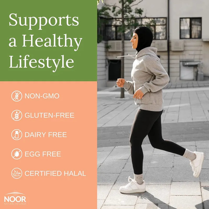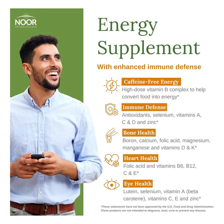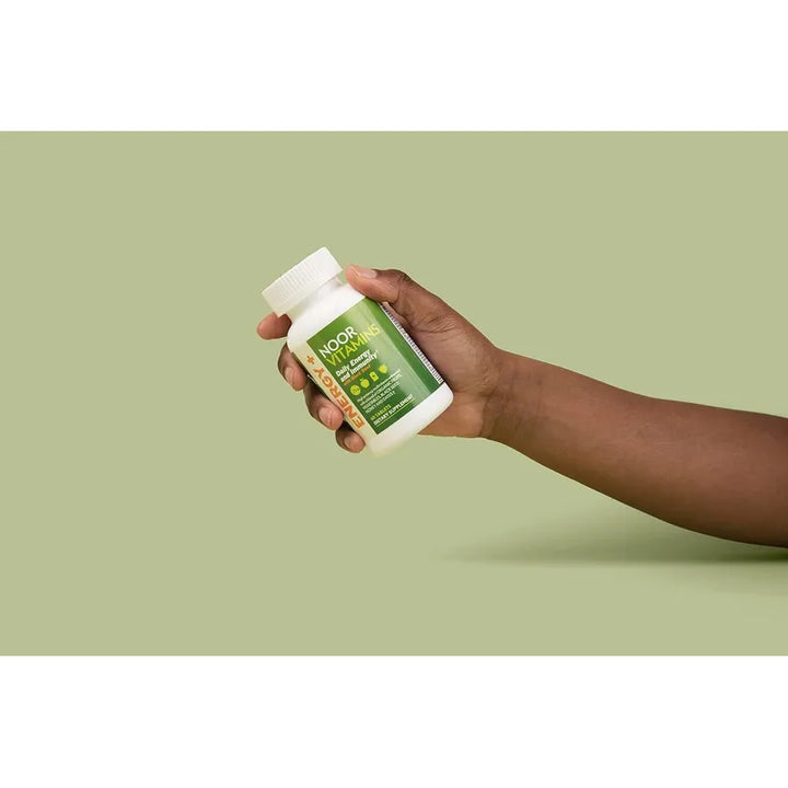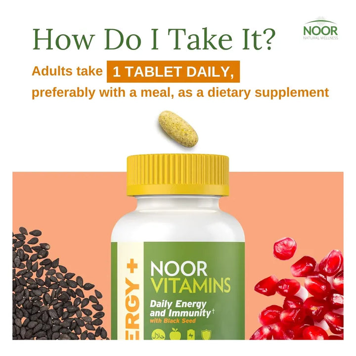¿Te sientes agotado al final del día? ¿Buscas una manera natural de reforzar tu energía y sistema inmunológico? Te presentamos Noor Vitamins Energy+, el multivitamínico halal que transformará tu rutina diaria. Libre de cafeína, combina un potente complejo de vitamina B con semillas negras, miel y dátiles para ayudar a transformar tus alimentos en energía.